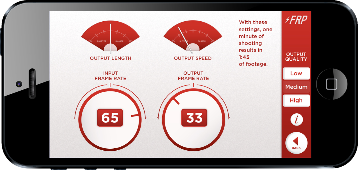 Frame Rate Pro is an iPhone app used to create time lapse and other timing effects on videos. Users can adjust both input and output frame rate, as well as recording quality.
